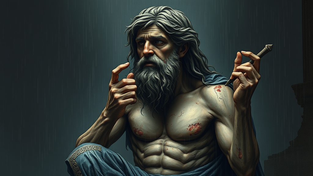A Greek deity depicted in a state of desperation, portrayed in a digital wallpaper with a dark background and muted colors—an epic and dramatic composition blending elements of expressionism. The scene is rainy, emotionally profound, leaving an indelible and haunting impression on the psyche, with an unforgettable and intricate design. Despite its intended grandeur, the piece suffers from visual imperfections: low quality, noticeable JPEG artifacts, with an air of ugliness. The figure is morbidly intriguing yet mutilated, featuring poorly drawn and distorted features—hands and face appear mutated, blurry, and dehydrated. The anatomy is flawed with disproportionate limbs, extra arms or legs, missing body parts, and a disfigured visage. Additional peculiarities include a long neck, and elements like a camera, name, signature, watermark, or trademark subtly intrude, further distorting the intended form.