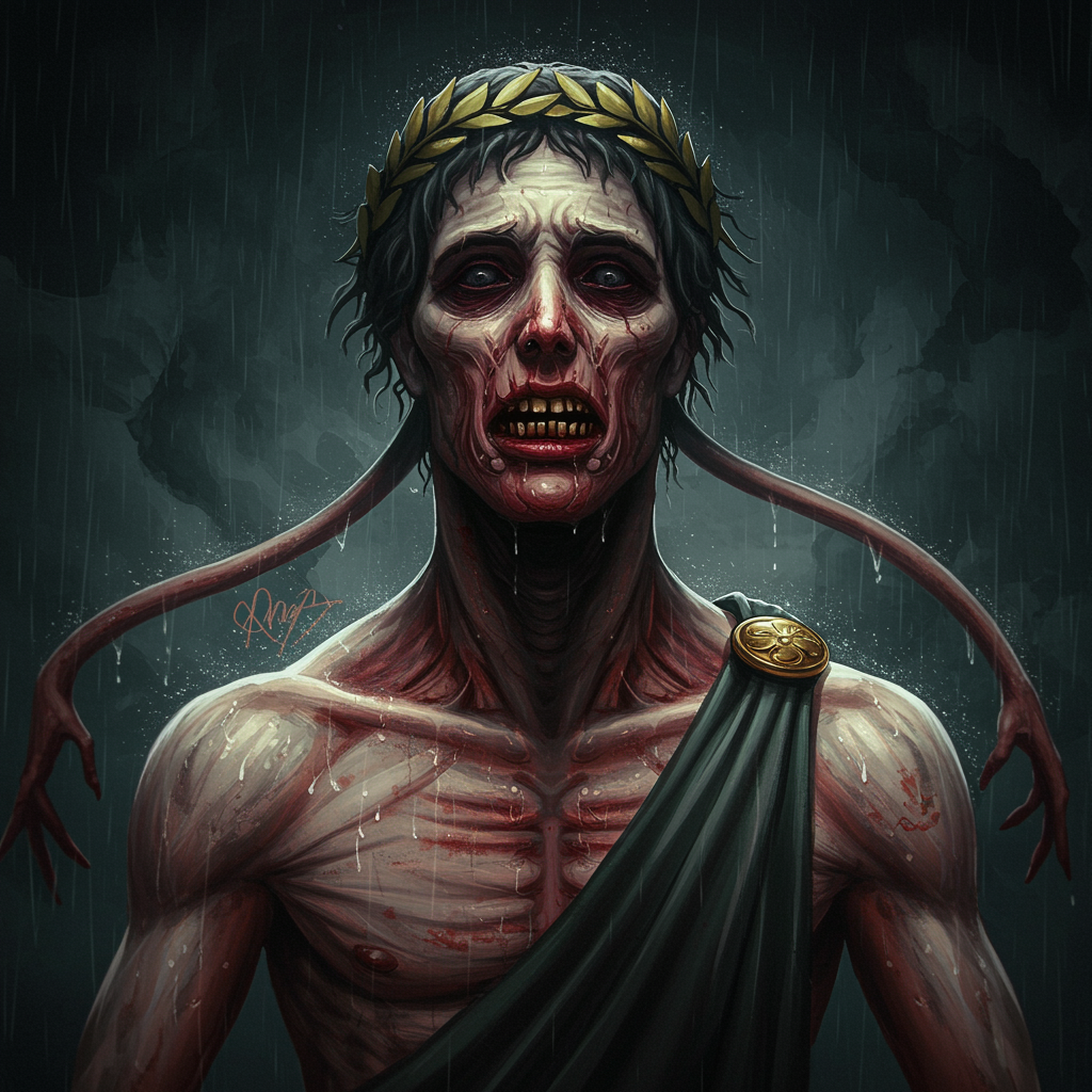 A Greek god, drenched in desperation, captured in a digital wallpaper portrait against a dark, rainy background. The muted colors bring forth a brutal epic composition, exuding drama. This digital painting embraces expressionism, emotionally profound, leaving an indelible and haunting impression on the psyche. The scene is unforgettable, with very intricate details. It bears the marks of worst quality akin to low resolution jpeg artifacts—ugly, duplicated, with a morbid touch. The god's features are poorly drawn, including mutated and deformed elements like blurry, dehydrated skin, bad anatomy, and distorted proportions. Extra limbs, cloned faces, disfigured features, and malformed limbs are rampant. Missing arms and legs sit alongside extra ones, invoking a grotesque curiosity. A bizarre, elongated neck extends awkwardly. Names, signatures, watermarks, logos, autographs, or trademarks are haphazardly placed, with face or body parts cut off and censored. The image encapsulates bad anatomy with a flawed body, face, and irregular teeth, shadowed by various deformities.