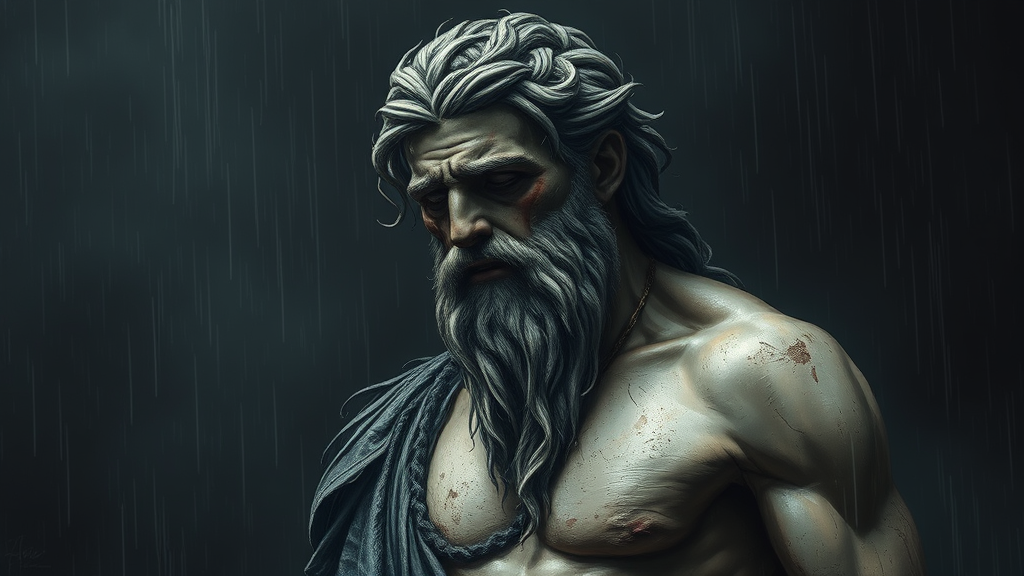A Greek god in a state of despair depicted in a digital wallpaper portrait with a dark background and muted colors. The composition is brutal and epic, capturing a dramatic and rainy expressionist scene. The portrayal leaves an emotionally profound, indelible, and haunting impression on the psyche, unforgettable and intricately detailed. The image features textural imperfections, with degraded quality and visible jpeg artifacts. The character is shown with poorly drawn and mutated features, including disfigured and blurry anatomy, bad proportions, and malformed, extra, or missing limbs. The face is distorted, with long neck and gross proportions. The presence of digital elements like a signature, watermark, or logo is subtly noticeable, adding a layer of intrusion and censorship to the composition.