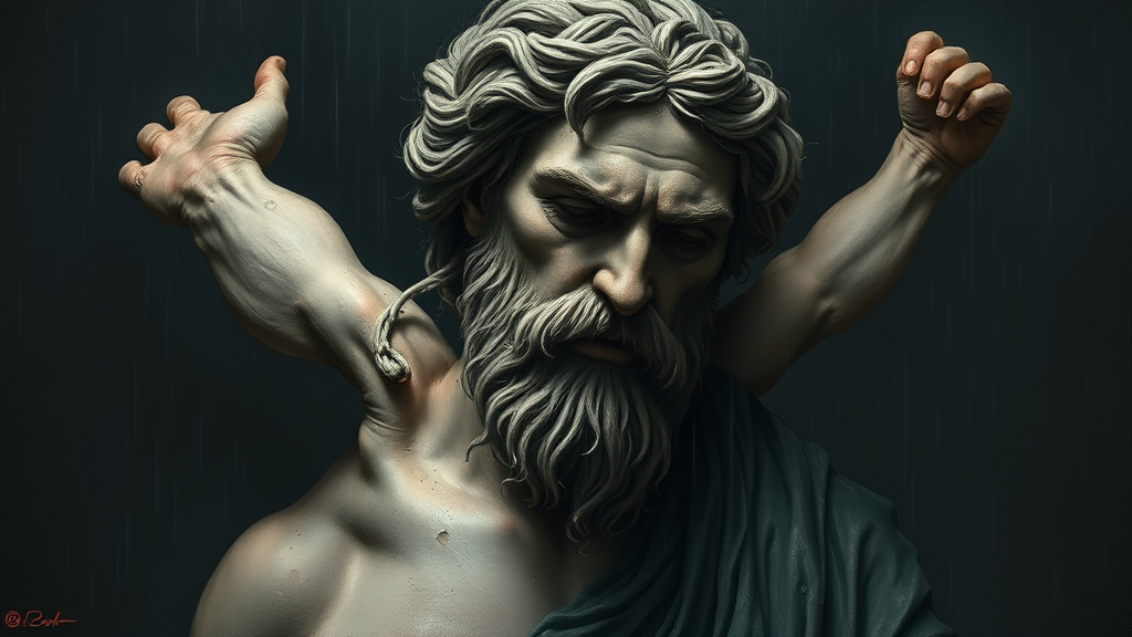 A Greek god in a state of desperation, captured in a digital portrait against a dark background. The composition is brutal and epic, featuring muted colors and a dramatic, rainy atmosphere. The painting exudes a sense of expressionism, leaving a deeply emotional and haunting impression on the viewer's psyche. The portrayal is unforgettable, intricate, and filled with raw emotion. Despite the profound themes, the artwork is plagued with intentional imperfections: noticeable jpeg artifacts, awkward duplications, and unsettling deformations such as poorly drawn faces and hands, distorted anatomy, and bizarre proportions. The figure exhibits a surreal mutation with extra and missing limbs, elongated necks, and misaligned features, contributing to an eerie and morbid aesthetic. Overlay elements like a camera component, illegible signature, and cut-off watermark add to the chaotic yet compelling intrigue of the piece.