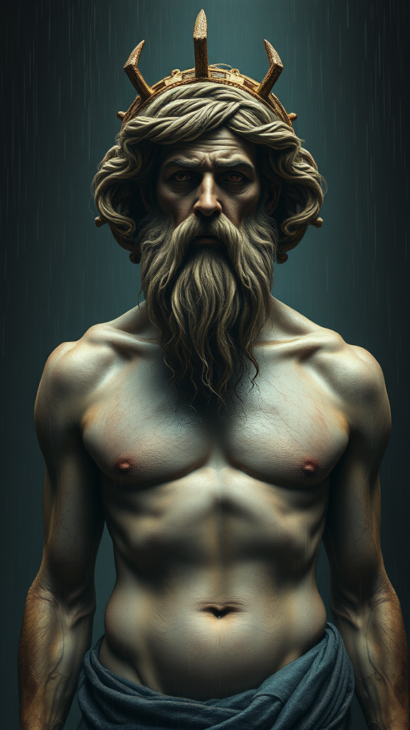 A Greek god in despair, captured as a digital wallpaper portrait, featuring a dark, rainy background with muted colors. The composition is brutal and epic, with a dramatic expressionist style that leaves an emotionally profound, haunting impression. It's unforgettable in its intricacy. The image is intentionally low quality with visible jpeg artifacts, adding an unsettling atmosphere. The god appears with distorted features: poorly drawn, with bad anatomy and grotesque proportions. His face and body show mutations—deformed, blurry, with mutated limbs and disfigured features. There are duplicated elements like faces and limbs, and parts are missing or malformed. The figure's proportions are off; with a long neck and exaggerated limbs, it evokes a sense of disorder. The image carries marks of imperfection with text, watermarks, and indications of being cut off, enhancing its morbid allure.