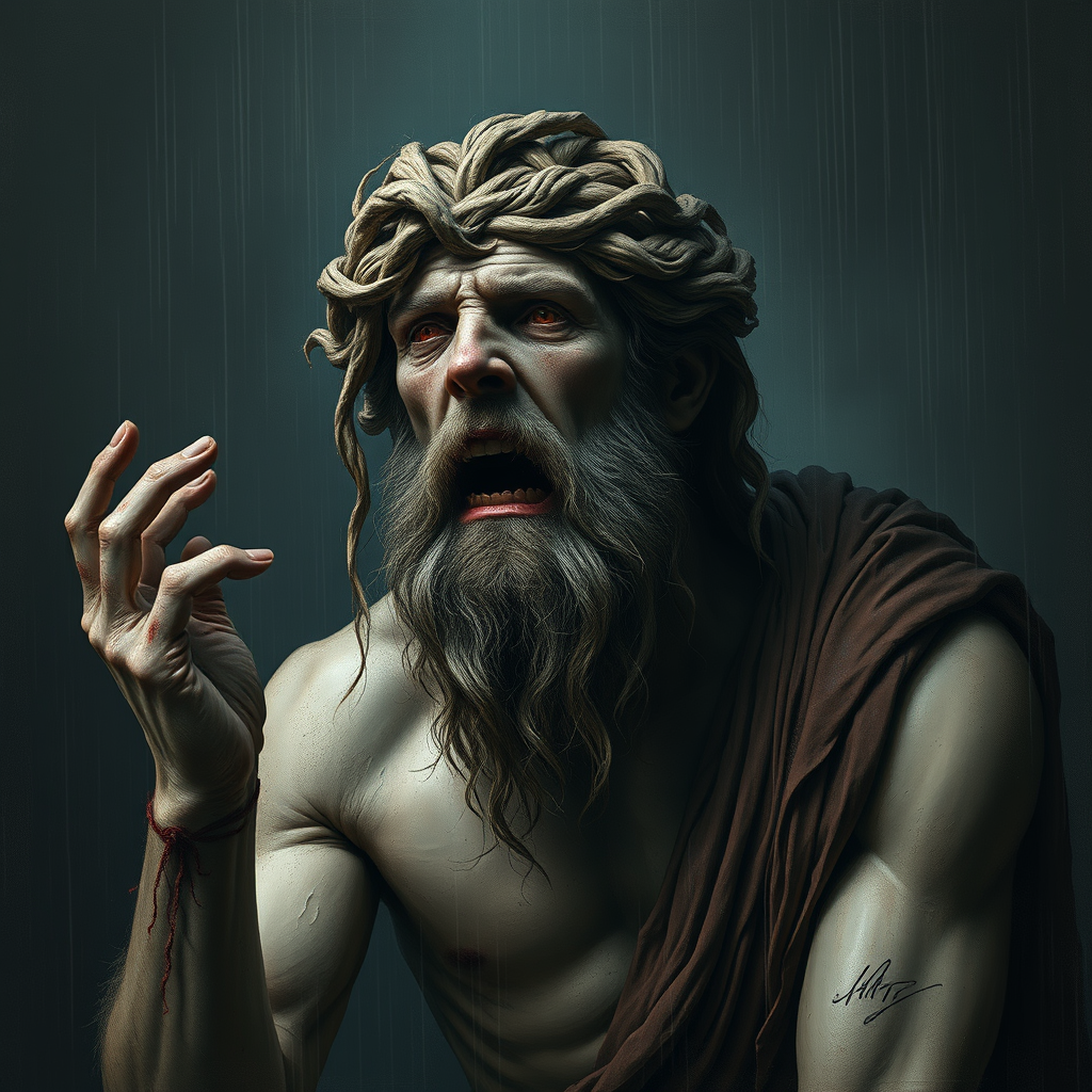 A Greek god in despair, depicted in a digital wallpaper portrait with a dark backdrop and muted tones. The composition is brutally epic and dramatic, presented in a digital painting style. It features a rainy, expressionist atmosphere, imparting an emotionally profound and haunting impression on the viewer's psyche. The intricate details are unforgettable, yet marred by elements such as worst quality artifacts, low resolution, and ugly, morbid features. The god's body is portrayed with poorly drawn hands and face, mutations, and deformed anatomy. The proportions are disturbingly off with extra limbs, cloned and disfigured features, and grossly malformed and missing parts. The depiction includes a long neck, distorted proportions, and is accompanied by camera artifacts, hastily included text, and a clutter of signatures or watermarks, adding to the chaotic scene.