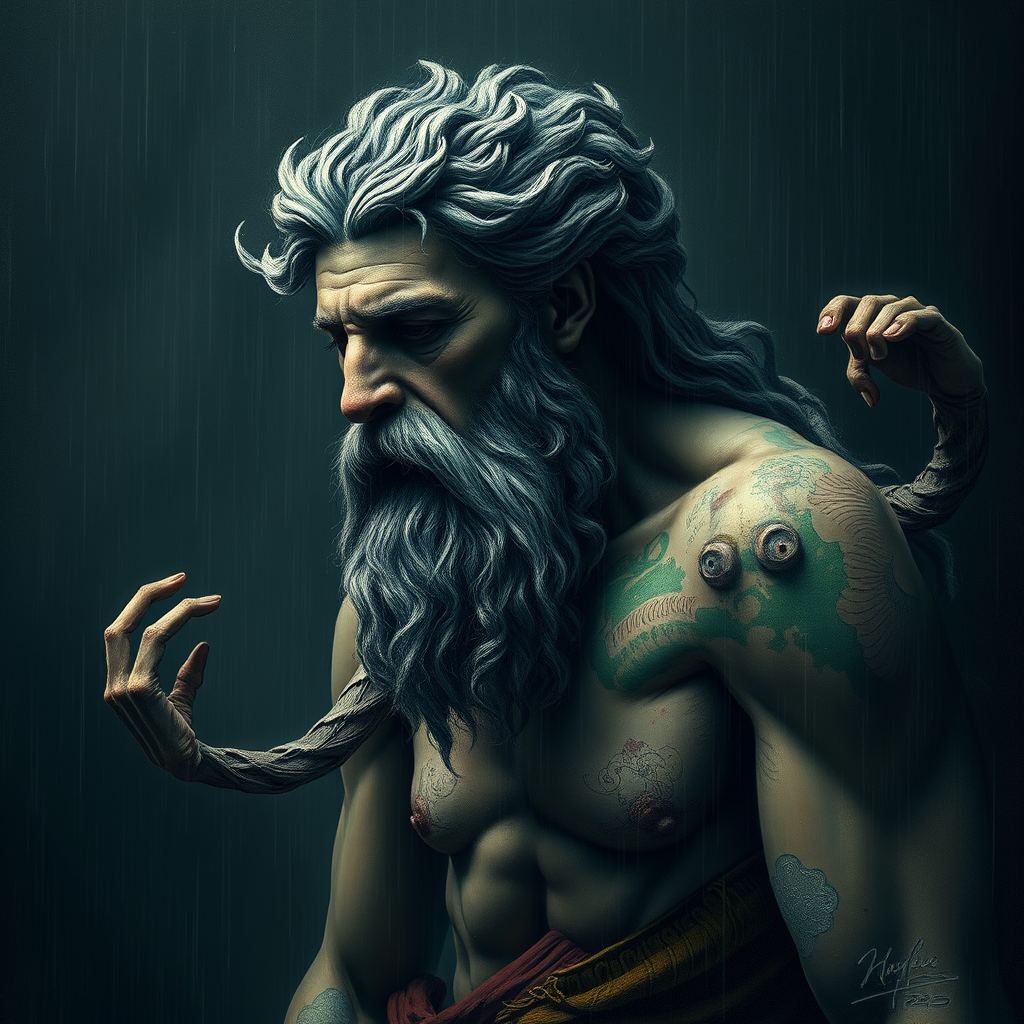 A Greek god in despair, depicted in a digital wallpaper portrait with a dark background and muted colors. The composition is brutally epic and dramatic, created as a digital painting with a rainy atmosphere. The style is rooted in expressionism, evoking profound emotions, leaving an indelible and haunting impression on the psyche. This unforgettable piece is very intricate, featuring elements such as jpeg artifacts, low quality, and intentionally distorted features. Elements of mutation are present, with deformed and exaggerated body proportions, extra limbs, and disfigured, blurry anatomy. The portrait includes a long neck and malformed limbs, with some extremities missing or duplicated. Details like signatures, watermarks, or logos may be subtly incorporated as part of the artwork, adding to the overall chaotic and unsettling aesthetic.