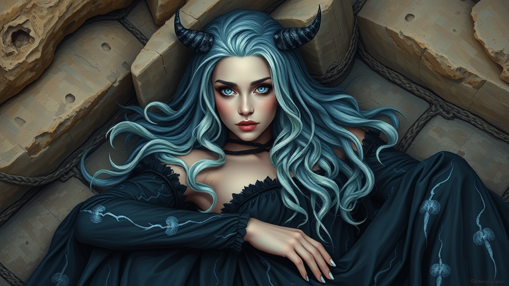 A Greek priestess with two-tone, streaked hair resembling plant tendrils, emanating a cold aura. Her striking ice blue eyes contrast against a backdrop inspired by the sites of human evolution at Mount Carmel's Nahal Me’arot Caves. She embodies a fusion of cyber fairy grunge style, lying gracefully on a lap. Her form is adorned in an elaborate animal-themed costume in a nuanced black palette. The costume is detailed and iridescent, reminiscent of a one-piece character design. This scene comes alive in the form of a highly detailed illustration, oil painting style, drawing inspiration from vast imaginary realms. The colors are vibrant yet weirdly enigmatic, with careful blending to create a dreamlike, almost surreal quality. Her proportions are unique, adding a touch of whimsy and mystery to her presence. The setting, though ethereal, avoids typical flaws such as unrealistic anatomy or disproportionate features, keeping the image captivating and harmonious.