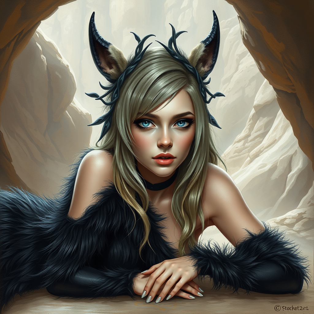 A Greek priestess with unique streaked, two-tone hair, resembling plant-like textures, exuding a cold aura. She is positioned against the backdrop of the fascinating sites of human evolution at Mount Carmel's Nahal Me’arot caves. Her style combines cyber fairy grunge elements, as she lies down gracefully, gazing with ice blue eyes that seem to hold a mysterious gradient. Her attire is an elaborate black-themed animal costume, exhibiting the meticulous detail of a one-piece character, rendered with stunning iridescence. The illustration captures the essence of an ArtStation-worthy oil painting portrait, rich in vibrant yet slightly unconventional colors that add to its allure. Despite the unreal aspects, the depiction is both mesmerizing and surreal, drawing viewers into a realm where mythology and modernity intertwine seamlessly.