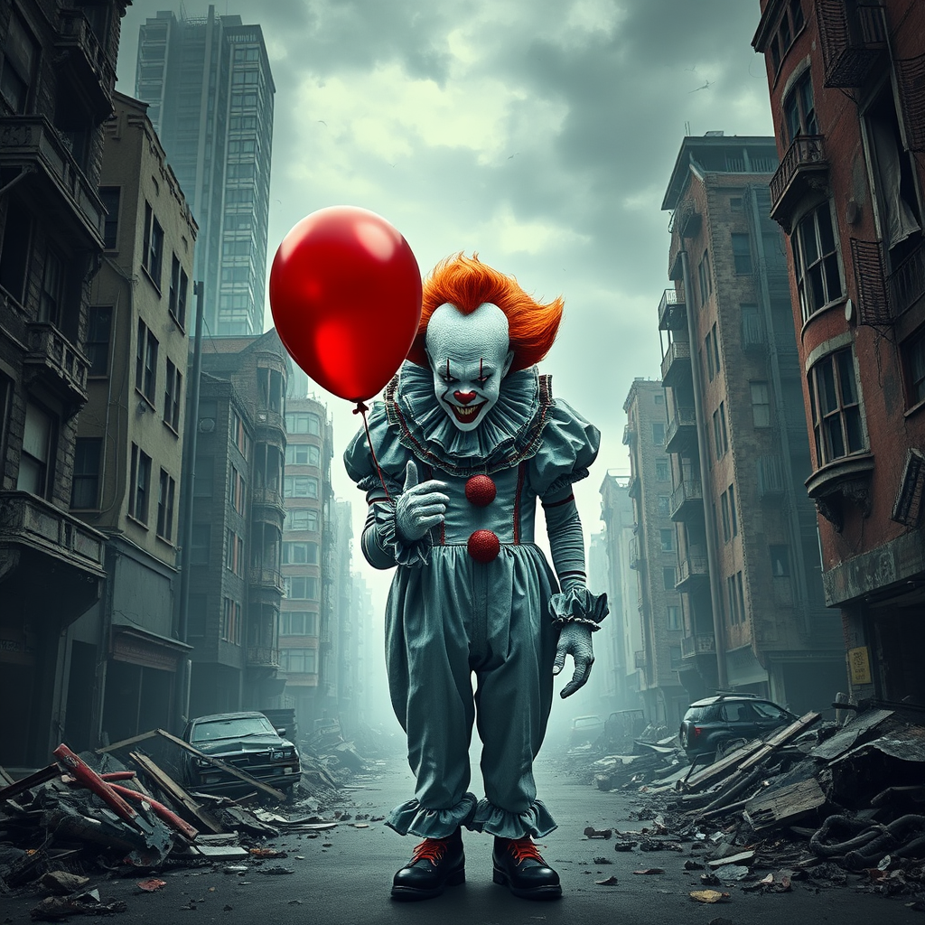 A grinning Pennywise-like clown clutching a crimson balloon stands amidst a dystopian, post-apocalyptic landscape filled with crumbling and decayed buildings, evoking the chilling atmosphere of a scene reminiscent of the IT movie, depicted with striking photorealism.