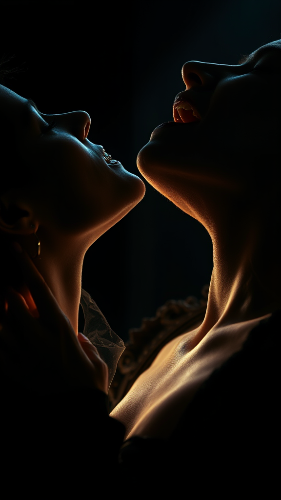 A gripping image portrays a woman tilting her head back with eyes closed, offering her neck to a ravenous vampire. The scene is bathed in cinematic low light, creating deep shadows and intense, high-contrast lighting that envelop the setting in a haunting, mysterious ambiance. The intricate details and textures are captured in stunning clarity, featuring hyper-realism in ultra-high definition. The light plays dramatically across their features, emphasizing the vampire's sharp fangs ready to plunge into her delicate skin, enhancing the overall eerie effect. Deep tonal contrasts and rich hues saturate this atmospheric moment, captured in breathtaking 8K resolution, delivering a vivid portrayal of suspense and allure in a wide 7:6 aspect ratio.