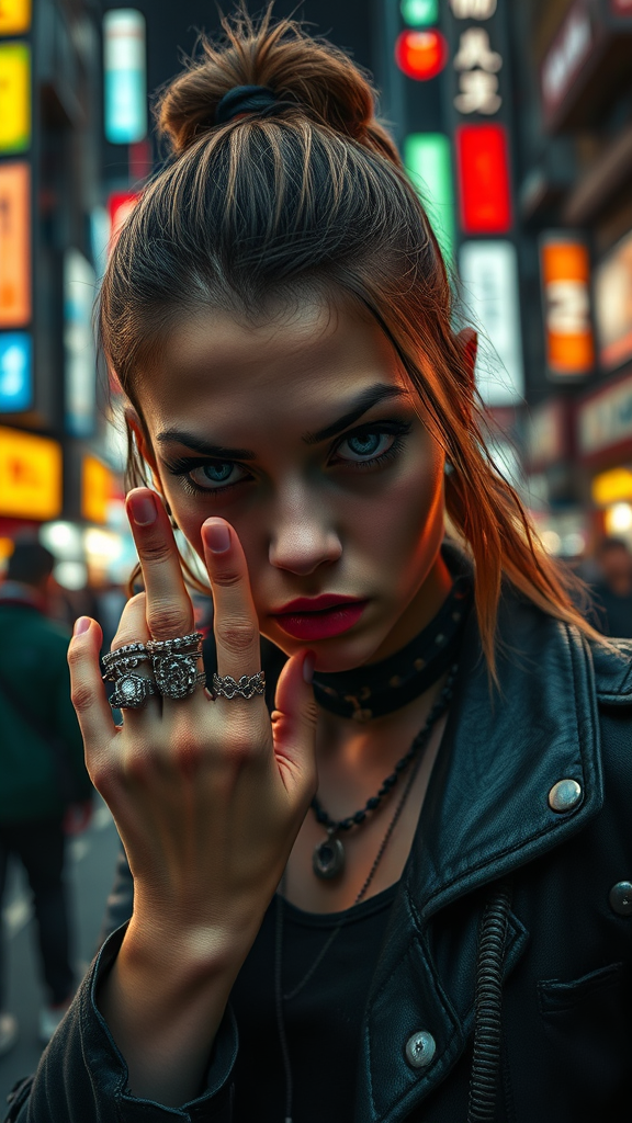 A gritty close-up portrait of a tough female street punk navigating the bustling streets of Tokyo at midnight. Her determined expression is highlighted by the city lights reflecting off her intense eyes. Despite the chaos and energy of the urban landscape, she stands out with her distinctive style. Her fingers, adorned with intricate rings, are positioned confidently, and her stance embodies strength and resilience. Her attire showcases a blend of punk and street fashion, with hints of innovative creativity. The atmosphere captures the essence of Tokyo's vibrant nightlife. The scene is free from any artistic flaws, ensuring a captivating and authentic representation.