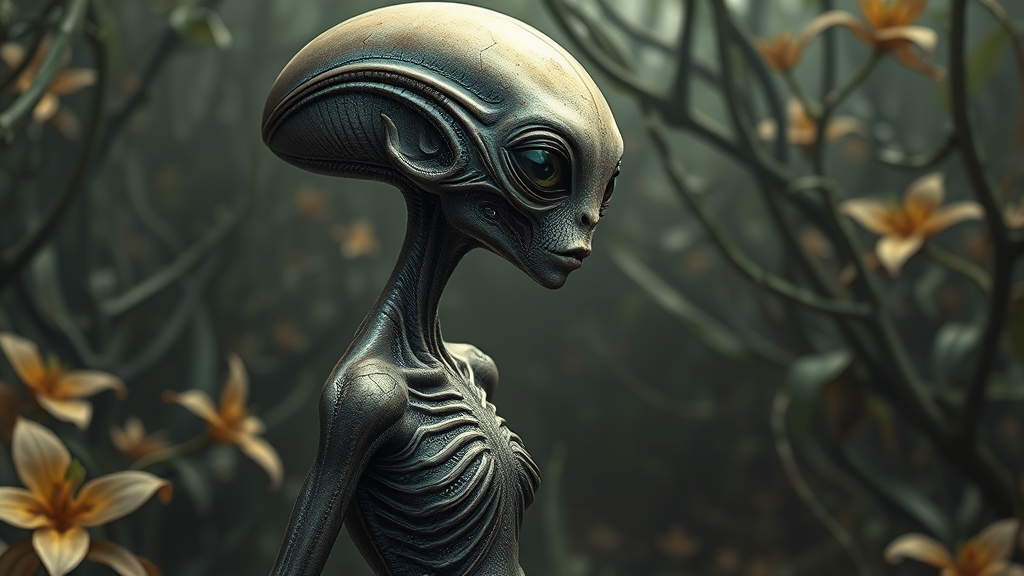 A gritty, realistic depiction of a female alien shown in side profile, capturing the entire body with intricate details. Her skin is textured and iridescent, reflecting an otherworldly bioluminescence. The elongated limbs and unique skeletal structure suggest a creature evolved in a low-gravity environment. Her eyes are large, with vertical slits, exuding a sense of intelligence and mystery. Intricate patterns reminiscent of tribal markings adorn her skin, hinting at a rich cultural heritage. Subtle variations in hue cascade across her body, playing with shadow and light to emphasize her ethereal nature. The setting hints at a dense, foreign landscape, with unfamiliar flora weaving throughout the background, enhancing the alien mystique.
