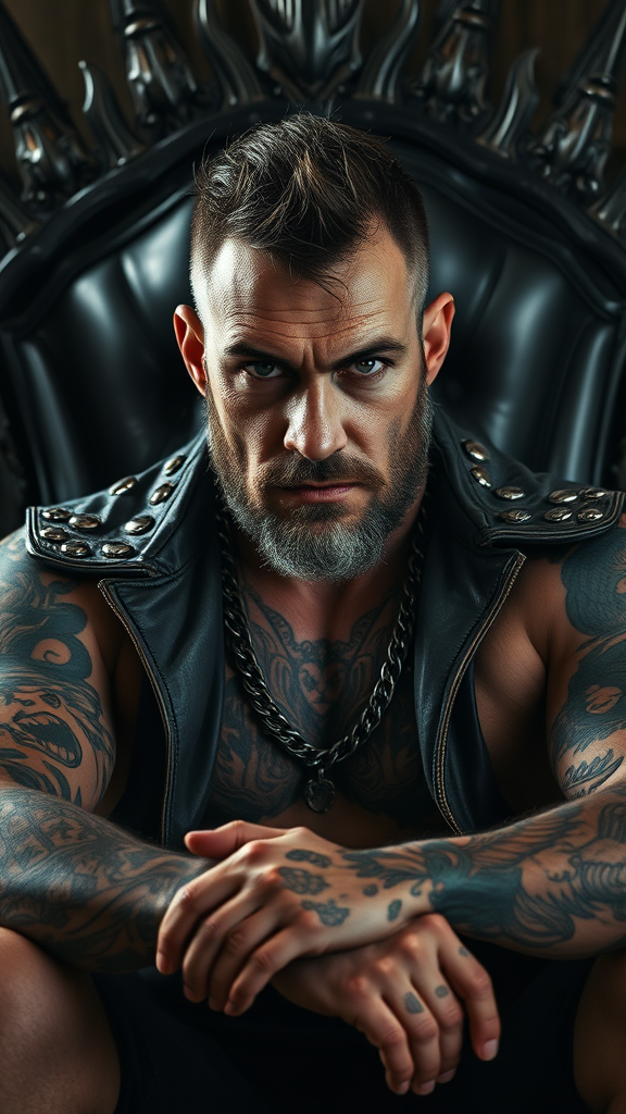 A grizzled, rugged man with intense, fierce features sits confidently on a throne, embodying the raw essence of punk culture. His muscular frame is adorned with intricate tattoos, each telling its own dark story. He gazes directly into the viewer's eyes with a penetrating, formidable stare. This hyper-realistic, full-length portrait captures the essence of his rough skin in meticulous detail, executed with sharp, cinematic precision. The photograph is taken in ultra-high-definition, 8k resolution, showcasing the interplay of light and shadow in a soft, diffused glow that highlights the textures and depth of his tough, battle-worn exterior. Subtle creative elements include a metallic studded jacket and chains, adding to his menacing yet compelling presence. The atmosphere exudes a raw, unapologetic intensity, reflecting the dramatic, high-stakes world reminiscent of an epic fantasy realm.