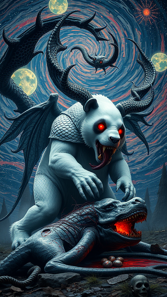 A grotesque behemoth, resembling a panda with cicada wings, majestic reindeer horns, and dragon scale armor, stands prominently in a haunting landscape. Its skin is an otherworldly, pure white, and its eyes glow a fierce, bright red, surrounded by luminescent scales. The creature feasts voraciously on the carcass of a once-beautiful beast beneath a swirling, starry sky reminiscent of Vincent van Gogh’s artistry, interwoven with the intricate glass-like patterns of FW Murano style. This scene captures a hauntingly macabre and morbid atmosphere, in breathtaking ultra-realistic detail, rendered with meticulous care in octane, high-definition, evoking the surreal narrative of a dark NFT creation. The terrain mirrors a dreamscape where reality and nightmare converge, every element crafted with incredible detail, mid-journey to a fantasy world beyond comprehension.