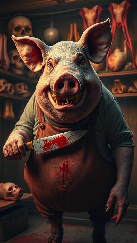 A grotesque, corpulent pig stands ominously in the foreground, serving as a butcher in a dimly lit room adorned with human parts displayed in the background. Its menacing, crooked smile reveals jagged, broken teeth as it stares directly into the camera with unnervingly skewed eyes. In one deformed hoof, it wields a bloodied butcher's knife. The scene is drenched in dramatic, warm lighting that highlights the hyper-realism of the details, from bloodstains on its clothes to the unsettling imperfections of its elongated body and neck. Oversaturated colors create a surreal tension, with incongruous anatomical features such as collapsed eyeshadow and misplaced fingers adding to the jarring visual. The atmosphere is further disturbed by elements like conjoined and deformed digits, offering an unsettling, tableau of absurdity. Without any distinguishing marks like a signature or artist name, the image remains hauntingly anonymous and intensely detailed, reminiscent of trending visual narratives on art platforms.