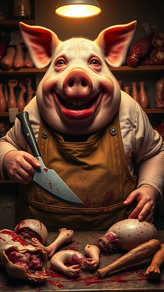 A grotesque, obese pig butcher with a macabre, painted-on smile, sporting crooked, broken teeth and pursed lips, locks eyes with the viewer beneath a warm, golden glow. The butcher's knife, smeared with crimson, leans against a worn, blood-stained apron. Unnatural, bulky, and disfigured, the pig's body strains against its clothes, which are stained and tattered, while its features seem deliberately exaggerated, akin to a warping of photographic reality. The backdrop of the butcher shop appears to be a disarrayed assortment of human limbs and organs, draped carelessly across a counter or stacked haphazardly against shelves. In the foreground, several human parts, like opened, sliced, or disassembled organs, lie scattered on a counter, alongside mangled limbs, resembling a hackneyed nightmare. The overall atmosphere is one of macabre and puerile unease, mangled reflections, thick with symbolism, mystery, and intrigue.