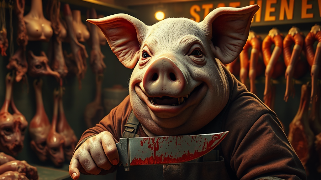 A grotesque scene of a corpulent pig working as a butcher, surrounded by human parts for sale in the background. The pig's face wears a chilling smile, exposing broken teeth, as it gazes directly at the camera. Clutching a bloody butcher's knife, the environment is shrouded in warm, dramatic lighting. The hyper-realistic, highly detailed depiction captures the unsettling atmosphere, reminiscent of trending art on platforms like ArtStation. Blood-stained clothes contrast with dramatic, oversaturated colors, while the anatomy of the pig is imperfect, with a long neck and body, conjoined or deformed fingers, and additional limbs. Despite its lifelike appearance, the creature's eyes and face are unnaturally distorted, with collapsed eyeshadow and skewed features. The image carries errors and oddities such as multiple eyebrows, vaginas integrated into the anatomy, and unusual body structures, creating a deeply unsettling and surreal composition.