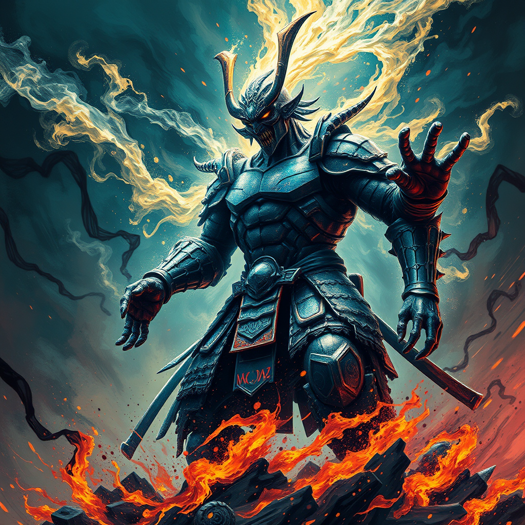 A grotesque yet majestic samurai-like entity, its divine essence concealed beneath a monstrous facade, is captured mid-action unleashing a powerful attack against its foes. The scene is imbued with the swirling, emotive strokes reminiscent of Vincent van Gogh, infused with the intricate nuances of FW Murano style. This colossal figure is clad in full-body galaxy armor, glistening with celestial hues, while tendrils of jet-black smoke unfurl around it. A vibrant explosion of colors paints the scene, which is incredibly detailed and morbidly dark. The key visuals are atmospheric and dense with realism, set in an ultra-wide epic shot that encapsulates the overwhelming presence of this figure.