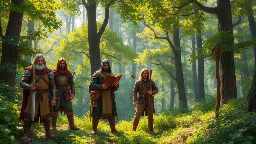 A group of adventurers, clad in weathered armor and cloaks of rich earthy tones, stand poised amidst a lush, vibrant forest. The sunlight filters through the thick canopy of towering trees, casting dappled patterns on the forest floor, rich with ferns and wildflowers. The air is alive with the sound of rustling leaves and distant birdsong. Each character carries a unique item, hinting at their diverse skills and stories - a gleaming sword, a tome of ancient knowledge, an intricately carved wooden staff, and an assortment of mysterious vials. Despite their varied backgrounds, there is a sense of unity and shared purpose, as they face the enchanting wilderness that spreads endlessly around them, hinting at the adventures yet to come.
