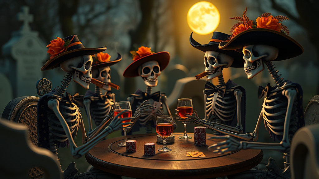 A group of animated skeletal figures, poised in a graveyard, engage in a game of poker amidst the vibrant celebration of Día de Muertos. Adorned with festive calaveras and elegant Catrinas, they revel under the moonlight, surrounded by a haze of cigar smoke and the subtle aroma of whisky in stout glasses. The scene captures a cinematic and eerie ambiance reminiscent of Tim Burton's imaginative style, drawing on sharp focus against a dreamy bokeh background. Colors are vivid and lush, encapsulated in UHD and HDR10 quality, conveying an exquisite and surreal tableau. The image is unblemished by modern digital artifacts, offering a pure and captivating window into this mystical gathering.