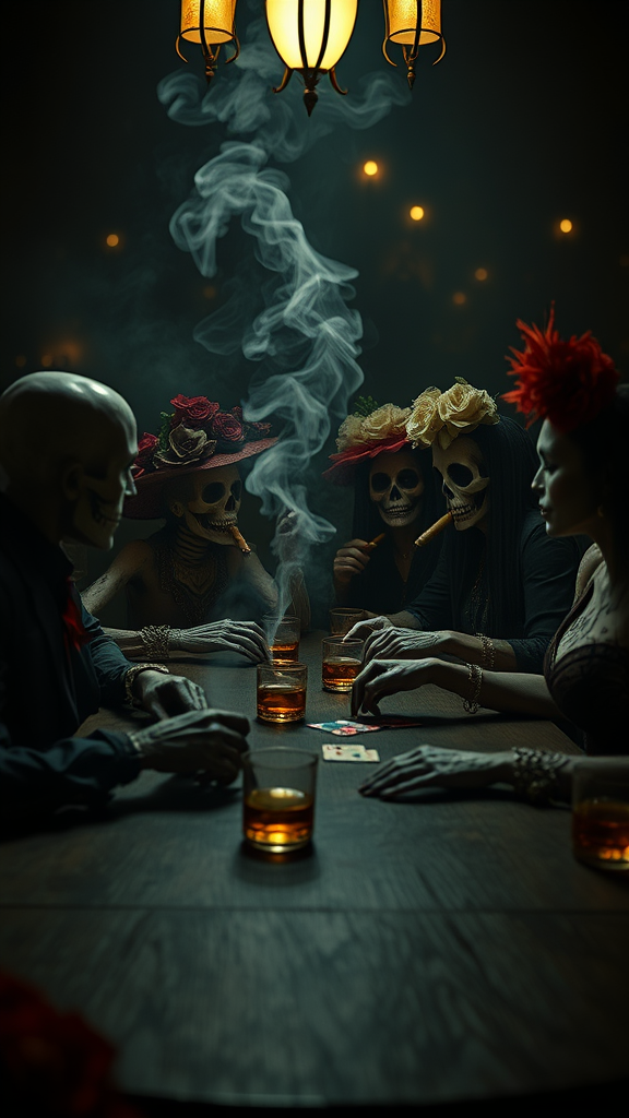 A group of calaveras and Catrinas playing poker in a dimly lit cemetery, surrounded by the essence of Día de Muertos. Cigar smoke swirls through the air, mingling with the scent of aged whisky in glasses on the table. The setting is imbued with a cinematic and eerie atmosphere, reminiscent of a Tim Burton film. The scene is captured in ultra-high definition with vivid colors, providing a sharp focus on the details while a subtle bokeh effect enhances the moody ambiance. This surreal tableau excludes any modern distractions such as watermarks or digital artifacts, enveloping the viewer in a seamless, immersive experience.