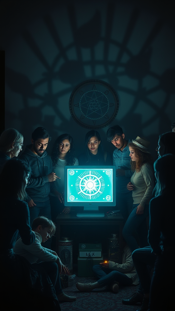 A group of diverse individuals gather around a glowing computer, its screen emanating an ethereal light that symbolizes AI. The setting is a dimly lit room, with shadows casting an intriguing pattern across the walls, creating a low key light cinema effect. The atmosphere is both surreal and mysterious, reminiscent of a supernatural, mystery thriller from the early 1980s. The composition is reminiscent of a tarot card, with each person embodying a unique character and role in this strange and esoteric gathering. The room is adorned with enigmatic symbols and artifacts, adding to the dream-like and otherworldly ambiance. Ultra clear resolution captures the scene with precision, highlighting the expressive power and uniqueness of the elements within this gathering. The overall aesthetic is dark and cool, imparting a highly esoteric vibe, as if the gathering holds a secret energy within the balance of light and shadow.