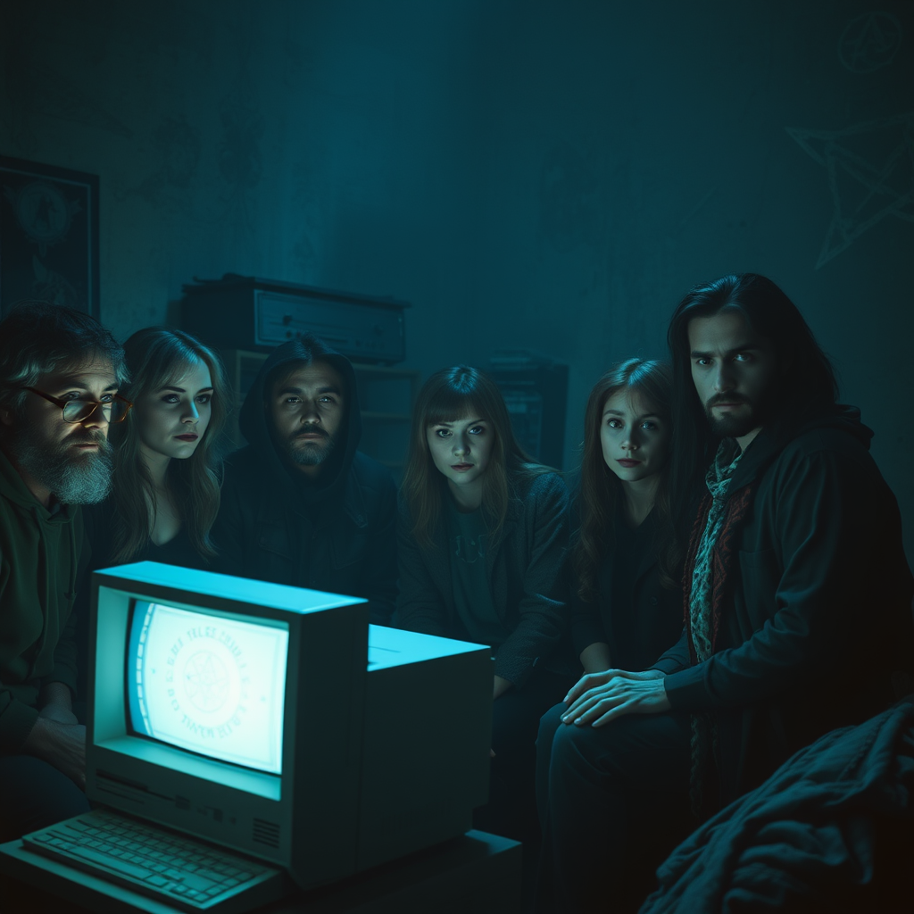 A group of diverse individuals gathers around an old computer, symbolizing early AI, in a dimly lit room. The setting exudes a surreal, ethereal vibe with an intriguing mix of 1980s retro and esoteric aesthetics. The composition draws inspiration from the mystical imagery of tarot cards, enveloping the scene in mystery and intrigue. Low-key lighting casts dramatic shadows, enhancing the supernatural atmosphere. The characters' expressions reveal a blend of curiosity and apprehension as they engage in this enigmatic living situation. The background subtly incorporates elements such as arcane symbols and faded, otherworldly textures, enriching the narrative with a dreamlike quality. Despite the dark and cool aesthetic, the image maintains an ultra-clear resolution, highlighting the expressive power and unique elements within the scene.