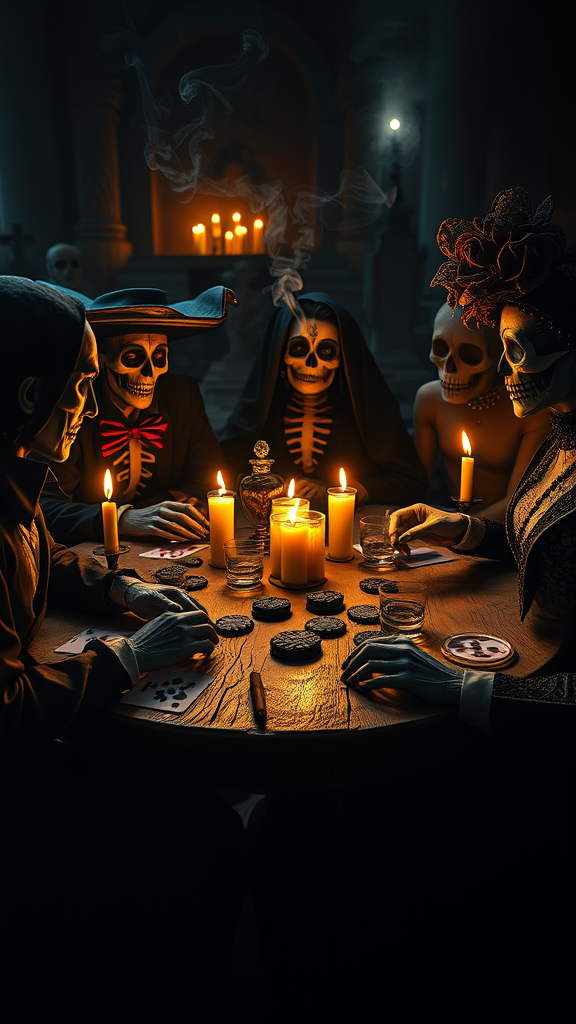 A group of elegant Día de Muertos figures engaged in a lively game of cards in a shadowy cemetery, surrounded by the essence of poker and the spirit of the Mexican Day of the Dead. Grinning calaveras and stylish Catrinas sit around a weathered table, their features illuminated by flickering candlelight casting haunting shadows. Wisps of cigar smoke curl through the air, blending with the rich aroma of whisky glasses scattered on the table. Captured in a cinematic and eerie moody scene reminiscent of Tim Burton's storytelling, the image is in sharp focus with a soft, dreamy bokeh effect. The vivid colors burst with life, presented in UHD with HDR10 quality, pushing the boundaries of resolution. The scene is characterized by an almost surreal clarity and perfection for an ultra-realistic depiction, capturing an immersive and atmospheric moment without any distracting elements.