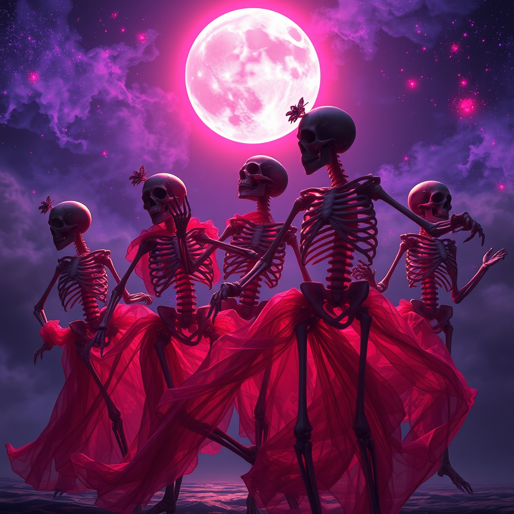 A group of intricately designed skeletons dance under a moonlit sky, their bony frames illuminated by an otherworldly glow in shades of dark purple and crimson. The scene evokes a sense of celestial elegance, reminiscent of Magali Villeneuve's captivating style, blended with the moody undertones of celestialpunk. Each skeleton is adorned with delicate, hyper-detailed embellishments, from ornamental armor to ethereal fabrics that flutter in an unseen breeze. The backdrop is a cosmic tapestry of swirling nebulae, hinting at Zacharias Martin Aagaard's penchant for creating breathtaking astronomical vistas. This fusion of fantasy and realism captures the enigmatic allure of a dark, brooding universe where the line between the living and the ethereal is gloriously blurred.