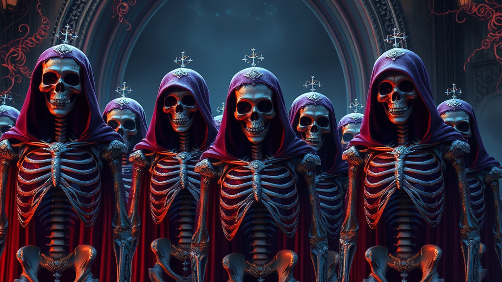 A group of intricately detailed skeletons adorned with celestialpunk armor, draped in dark purple and red hues, set against a mysterious, otherworldly backdrop. The scene exudes a dark and brooding atmosphere, reflecting the artistic styles of Magali Villeneuve and Zacharias Martin Aagaard. Each skeleton is sculpted with realistic hyper-detail, capturing the essence of fantasy art. The celestial elements in the design shimmer faintly, adding a touch of ethereal beauty that contrasts with the ominous setting, perfect for a captivating wallpaper.
