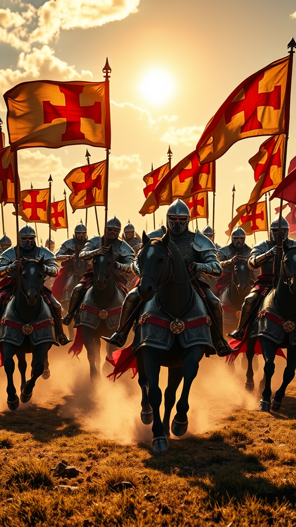 A group of Knights Templar charging into battle under the blazing sun, their powerful steeds kicking up clouds of dust. The Templar flags wave proudly in the air, each emblazoned with the iconic red cross. Their armor glints menacingly under the light, reflecting centuries of Christian valor, detailed with intricate patterns that hint at mysteries and secrets akin to the whispers of the Illuminati. Set in the 1150s, the scene captures the essence of medieval warfare with an epic, cinematic scope rendered in stunning detail. The backdrop is a rolling landscape, a testament to Unreal Engine's capability to bring out the realism and grandeur of this historical moment.