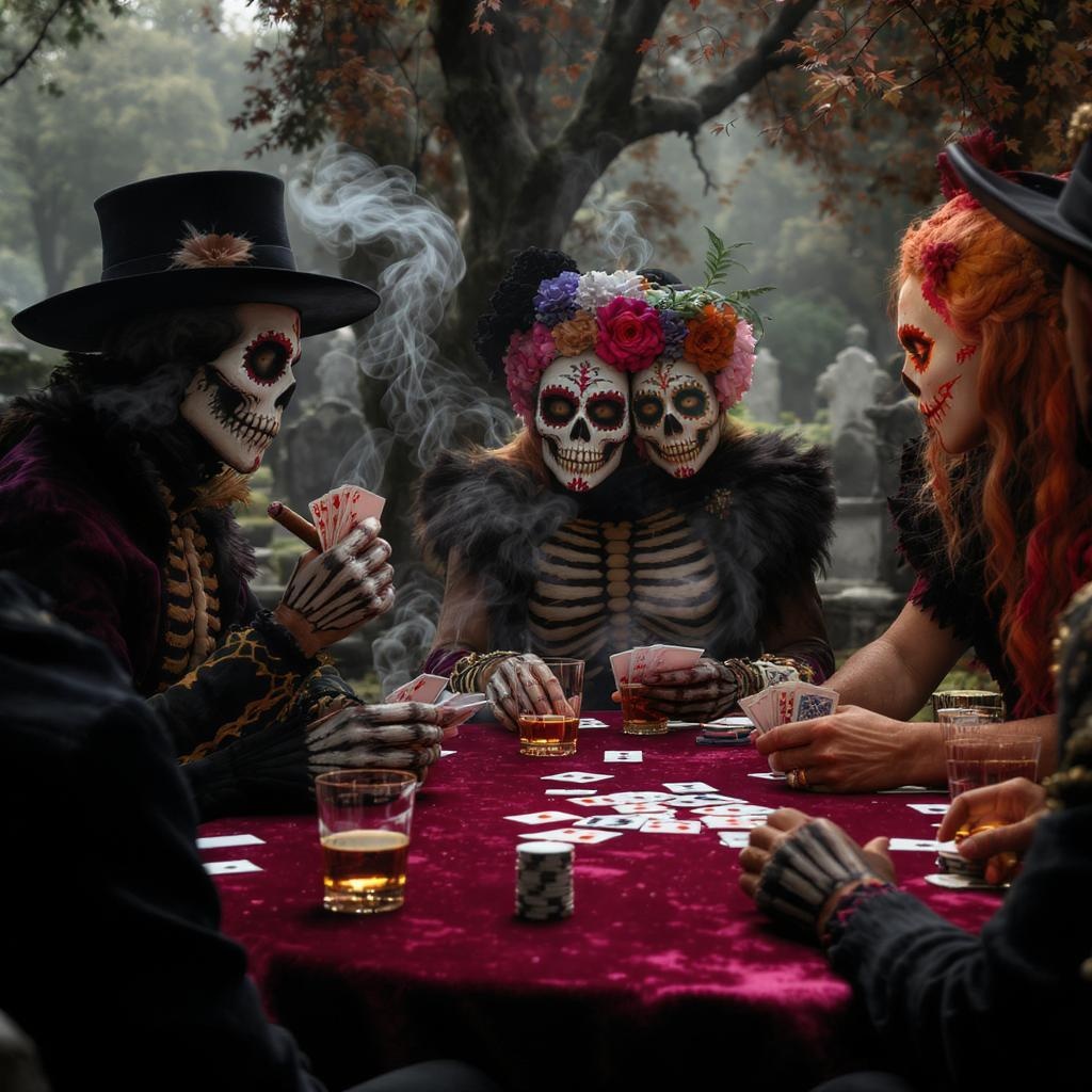A group of lively Día de Muertos characters playing cards in a cemetery, engaging in a spirited poker game amidst the gravestones. The scene captures the essence of the Mexican Day of the Dead, featuring vibrant calaveras and elegantly dressed Catrinas, with cigar smoke swirling in the air and whisky glasses on the table. The composition is reminiscent of a Tim Burton film, exuding a cinematic and eerie mood. The image is captured in sharp focus with a beautiful bokeh effect, showcasing vivid colors and stunning visual clarity in UHD, HDR10, and 16K resolution. The atmosphere is both surreal and engaging, retaining the core spirit of celebration and remembrance.