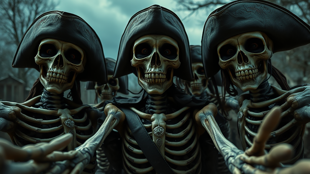 A group of skeletons and pirates pose for a selfie in a graveyard scene, capturing a scary, dark, and dramatic atmosphere with cinematic and vivid imagery. The scene is rich in extreme detail, conveying an intense mood. The visual is rendered in 16k UHD HDR, showcasing deformed irises and pupils, creating an unsettling gaze with crossed eyes. The characters exhibit cloned faces, extra fingers, and mutated hands, adding to the eerie quality. The image might be cropped and slightly low-res, with elements like text, jpeg artifacts, signatures, watermarks, usernames, artist names, trademarks, and titles subtly present. The composition involves multiple views with some features like long necks and parts out of frame, creating a chaotic yet fascinating scene.