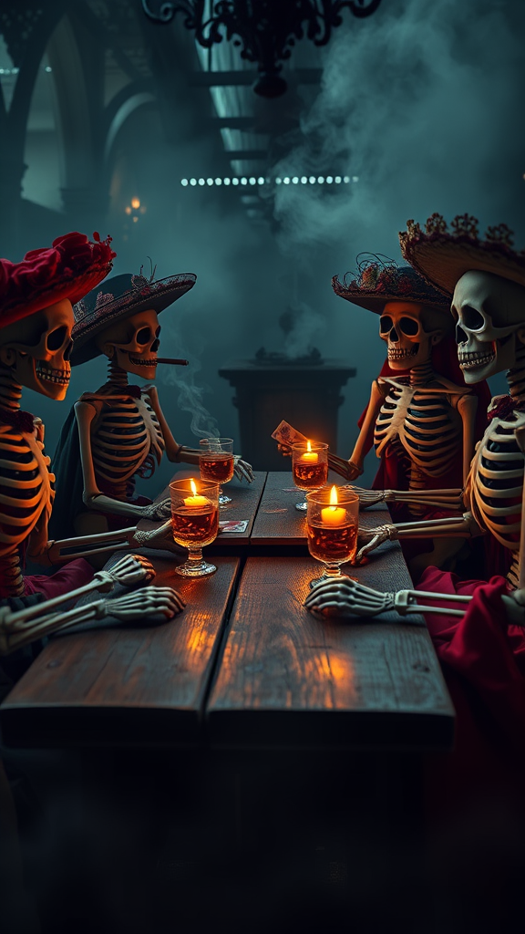 A group of skeletons celebrates Día de Muertos, playing cards in a misty cemetery, surrounded by cigar smoke and whisky glasses on an aged wooden table. Catrinas in colorful attire sit gracefully, their skeletal smiles illuminated by flickering candlelight. The eerie, cinematic scene exudes Tim Burton's signature touch with vibrant colors and deep shadows, captured in ultra-high-definition. The atmosphere is moody and surreal, with sharp focus on intricate calavera designs. The edges blur into a soft bokeh, creating an immersive, otherworldly experience. This vivid portrayal captures the essence of Mexican folklore while evoking a sense of whimsical mystery.