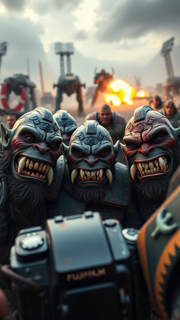 A group of space orcs posing for a selfie amidst the backdrop of a dramatic Warhammer 40k battlefield, capturing an award-winning photo with RAW clarity; shot in stunning 8k UHD on a high-quality DSLR, enhanced by dynamic volumetric lighting and a touch of cinematic film grain, using the impressive capabilities of a Fujifilm XT3 camera. In the background, towering war machines and distant explosions add a touch of chaos, while the orcs, adorned in battle-worn armor, proudly showcase their toothy grins and fierce expressions to commemorate their moment of camaraderie.
