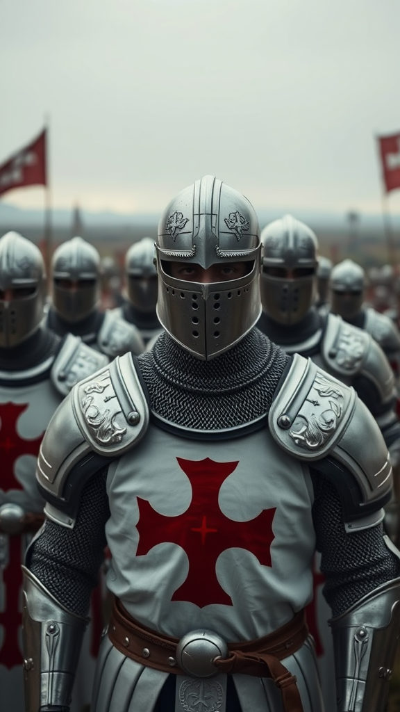 A group of Templar knights stands resolute on the cusp of a vast battlefield, each clad in pristine white armor adorned with a striking red cross on the chest. The centerpiece of focus is a knight in gleaming chainmail and steel, his helmet sculpted with intricate designs that catch the dim light. Their eyes, barely visible through narrow visors, are fixed on the horizon under a foreboding grey sky. Behind them, the battlefield stretches out, a hazy expanse punctuated by distant banners flapping in the wind. The scene is captured with a 50mm lens, creating a gentle depth of field that blurs the line of knights into an almost dreamlike procession, their armor clinking softly in the tense silence before the clash. The mood is stylized with an ethereal touch, emphasizing both the unity and the sobering anticipation of impending conflict.