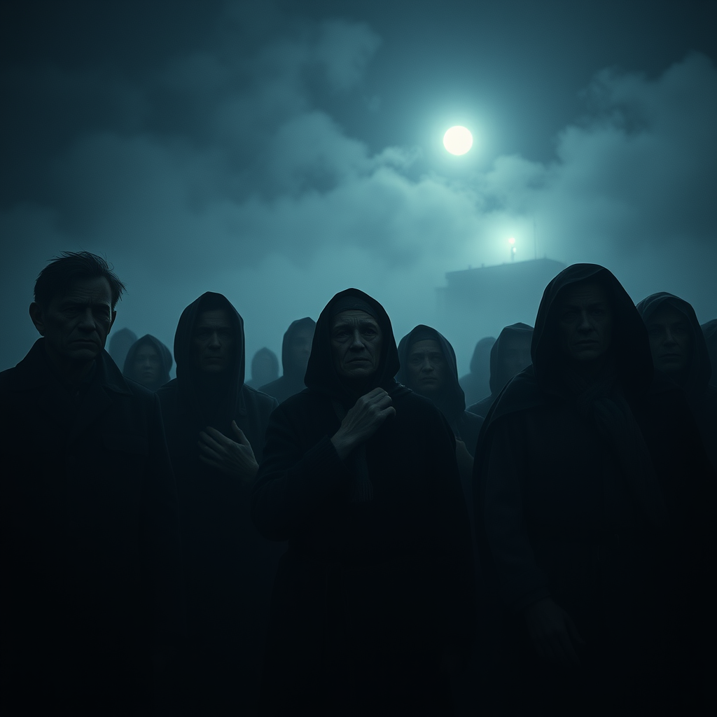 A group of World War II refugees stand in line, their faces etched with stories of survival, awaiting the elusive promise of safety aboard a distant boat. The scene is painted in chiaroscuro, the interplay of light and shadow bringing out the intricate details of their worn clothing and tired expressions. The moon casts a soft glow, struggling to penetrate the volumetric fog that envelops the midnight harbor. Their forms are hyperrealistic, capturing the essence of humanity in crisis, each figure meticulously detailed in ultra sharp focus. The atmosphere is cinematic, a comprehensive portrayal of a moment frozen in time, enhanced by a sense of tension and urgency. The fog swirls around them, creating an otherworldly aura, yet there's a low-res quality to their surroundings, hinting at the imperfections and chaos that permeate their lives. As they stand side by side, you sense a unity in their shared plight, though the scene is peppered with anomalies—missing fingers, misplaced limbs, and the occasional disfigured hand. Behind them, a distant building's light flickers, casting eerie shadows that dance across the ground. The scene is a tapestry of despair and hope, a testament to the resilience of the human spirit amidst adversity, with subtle hints of mutation and imperfection, reflecting the distorted reality of their world.