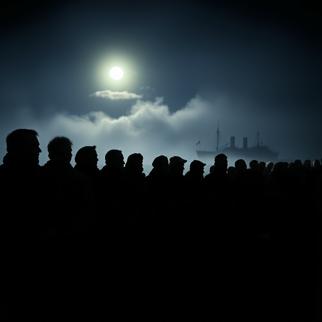 A group of World War II refugees waits solemnly in line, anticipating their chance to board a distant boat. The scene is illuminated by the soft glow of moonlight as midnight fog drifts around them. Their full bodies are captured in a highly detailed and hyperrealistic style, with an ultra-sharp focus that highlights their weary expressions amidst the chiaroscuro effect. The cinematic composition reveals the eerie stillness of the night, with shadows stretching across the surroundings. Despite the low-resolution ambiance, the quality remains impeccable, although some figures show signs of artistic anomalies, like missing or extra digits, blurred outlines, and minor deformations. The atmosphere is imbued with a sense of incompleteness, reminiscent of a historical photograph marred by time, where subtle distortions coexist with the compelling portrayal of human resilience. The scene evokes the haunting beauty and tragic reality of their journey, capturing a moment forever etched in history's margins.