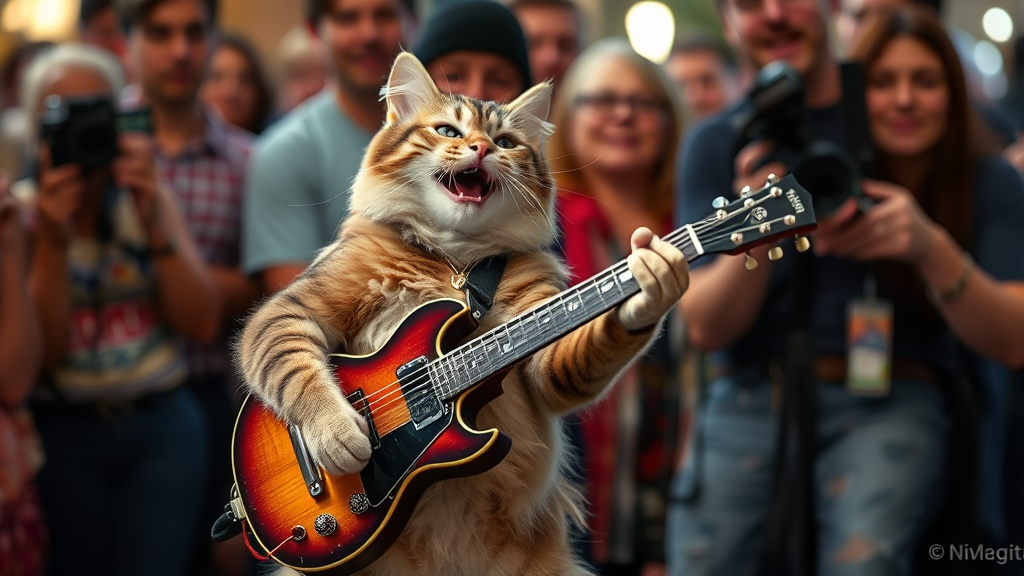 A guitar-playing cat dazzling the crowd with its rhythmic tunes and charming presence.