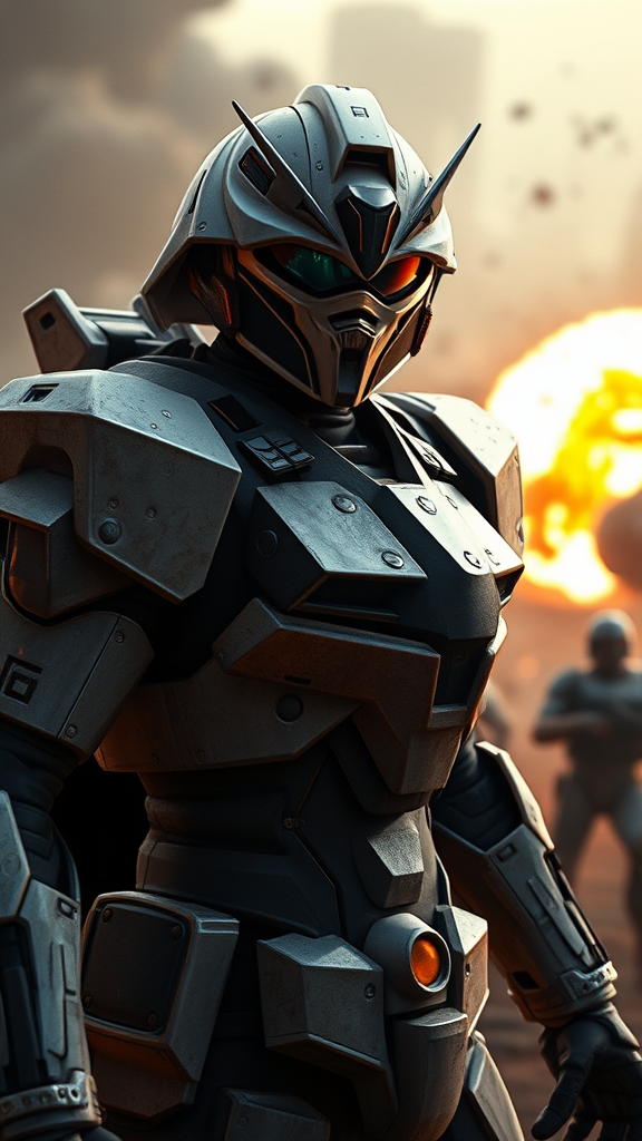 A gundam-styled counter-terrorist from the video game Counter-Strike, wearing a helmet with a visor resembling a white sheet with eye slits, standing in a dynamic, battle-ready pose. The scene is set in a chaotic warzone with explosions punctuating the background, enhancing the intensity of the cinematic shot. The armor design pays homage to the RX-78 with sleek, futuristic panels and muted colors that blend into the gritty landscape. The atmosphere is tense and immersive, capturing the essence of combat and strategy in a high-stakes environment.