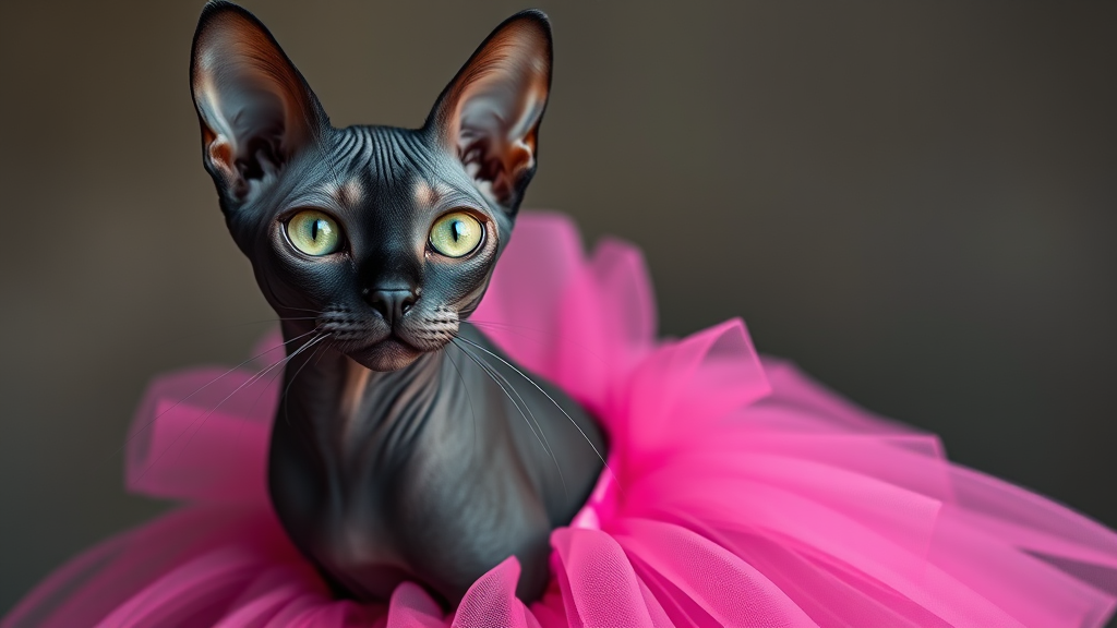 A hairless cat elegantly donning a vibrant pink tutu, with perfect eyes, rendered in hyperrealistic 8k photorealism, capturing the essence of dark beauty and intricate detail.