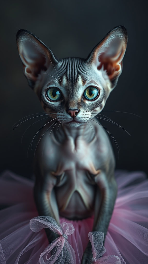 A hairless cat wearing a tutu, with perfect eyes, rendered in hyperrealistic 8k detail, a photorealism masterpiece with a dark, moody atmosphere, enhanced with subtle artistic touches for a unique and captivating effect.