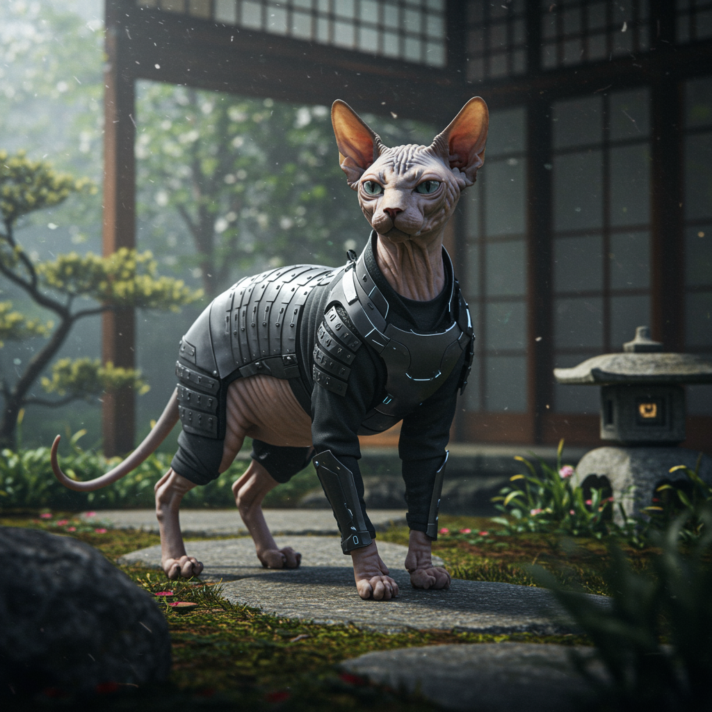 A hairless sphinx cat embodying a stoic samurai spirit, adorned in sleek, futuristic techwear-inspired samurai armor, stands poised within a serene Japanese garden. The scene is infused with ethereal fantasy and Zen Buddhism influences, creating an atmosphere of dreamlike serenity. The cat's armor gleams subtly under the soft light, while the meticulously detailed surroundings reflect a photorealistic yet surreal representation, capturing the essence of a gentle, otherworldly tranquility.