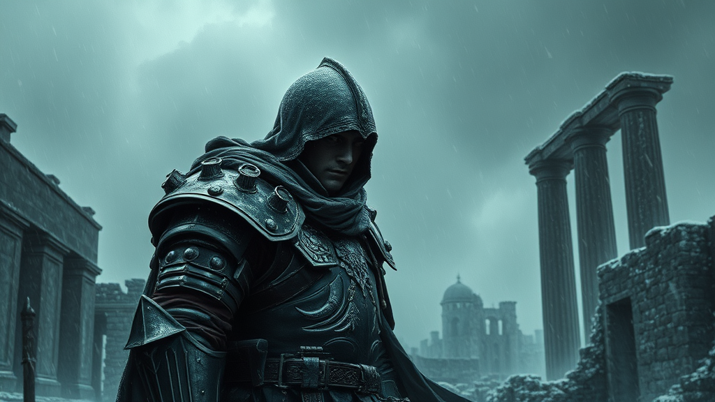 A half body portrait of a fierce warrior in armor, mythical fighter, spectral presence, tattered cloak, faceless, solitary amidst ancient ruins, snow falling, stormy skies, intense and epic composition, awe-inspiring, digital painting inspired by Eugene de Blaas and Ross Tran, dramatic lighting, moody, dark, misty, serene, sophisticated, intricately detailed, in a romanticism style, cinematic feel, reminiscent of Greg Rutkowski, exceptional resolution, unforgettable, slightly blurred, enigmatic, textured, mysterious, haunting atmosphere, without signatures or marks, capturing the essence of elegance and mystery.