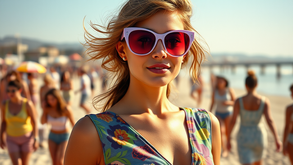 A half-body portrait of a free-spirited woman with a slender frame, adorned with heart-shaped lavender sunglasses featuring rose-tinted lenses. She wears a vibrant, multi-colored top with a bold, plunging neckline that captures the essence of the 1960s. She is standing on a lively beach from that era, surrounded by the warmth of the sun and the cheerful buzz of beachgoers.