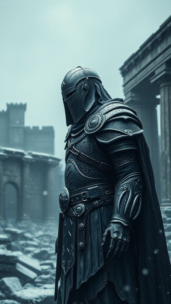 A half body portrait of a mythical warrior in intricate armor, legendary ghostly figure, wearing a tattered cloak, faceless and solitary amidst ancient ruins, snow falling gently in a stormy setting. The composition exudes a brutal yet awe-inspiring aura, embodying the essence of a digital painting influenced by Eugene de Blaas and Ross Tran. It features dramatic lighting that plays with dark, misty, and calm elements, capturing an elegant and highly detailed aesthetic reminiscent of romanticism. This cinematic piece, akin to the style of Greg Rutkowski, boasts absurd resolution and high quality. Despite the unforgettable atmosphere, the textures appear slightly grainy with a touch of blurriness and duplicity, lending an ethereal imperfection. The anatomy is artfully abstracted, with intentionally unusual proportions to intensify the ghostly allure, devoid of any text, signatures, or trademarks. The figure appears slightly distorted, embodying an enigmatic presence against the low-resolution backdrop of censored forms and intentional jpeg artifacts.