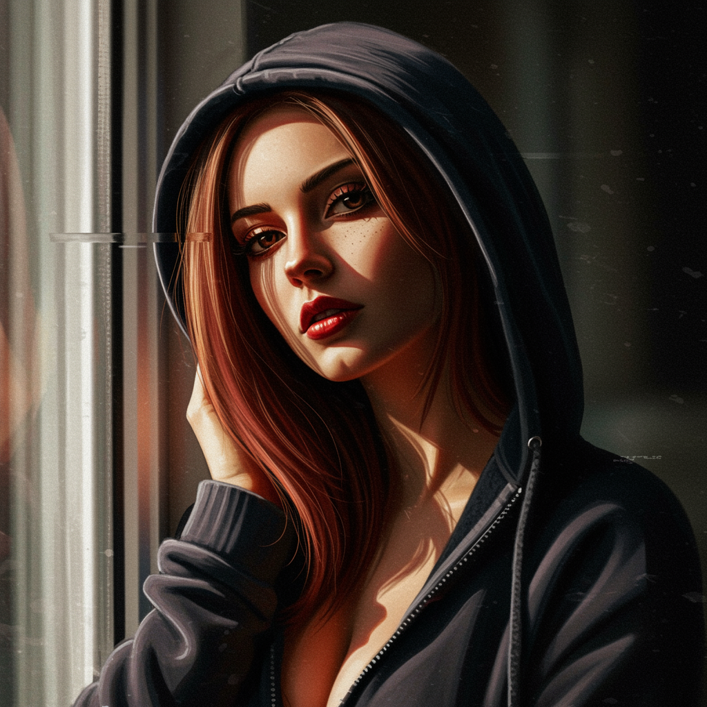 A half body portrait of a stunning girl by a window, wearing a hoodie, showcasing dynamic lighting and intriguing shadows. The style is an anime-inspired digital painting with a touch of comic artistry, created in 8k resolution with rough, muted colors. The piece is highly intricate yet retains a raw aesthetic, characterized by text elements and an intentional nod to lower quality aspects like jpeg artifacts. The composition hints at a gritty, imperfect charm with creatively altered features that incorporate imperfections such as elongated neck, blurred focus, and playful distortions in anatomy that challenge conventional beauty norms while maintaining a sense of artistic depth and intrigue.