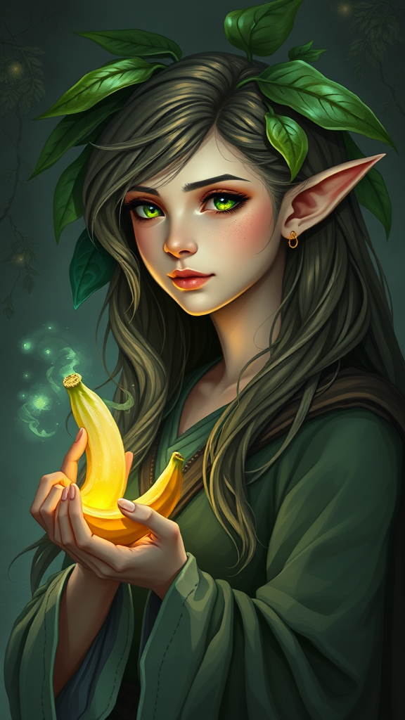 A half-elf sorceress stands gracefully, a mystical glow emanating from the banana in her hand. She embodies the essence of a forest mage with her ethereal presence and leaf-touched robes. Her piercing eyes reveal wisdom beyond her years, reminiscent of an elfin priestess deeply connected to nature's secrets. Delicately pointed ears peek through her cascading, leafy hair. The portrait captures her serene yet powerful demeanor in an epic fantasy art style, inspired by the works of Magali Villeneuve and Leona Wood. The detailed, symmetrical rendering highlights her as a figure of enchantment, a guardian of the wilds in this fantasy RPG-inspired world.