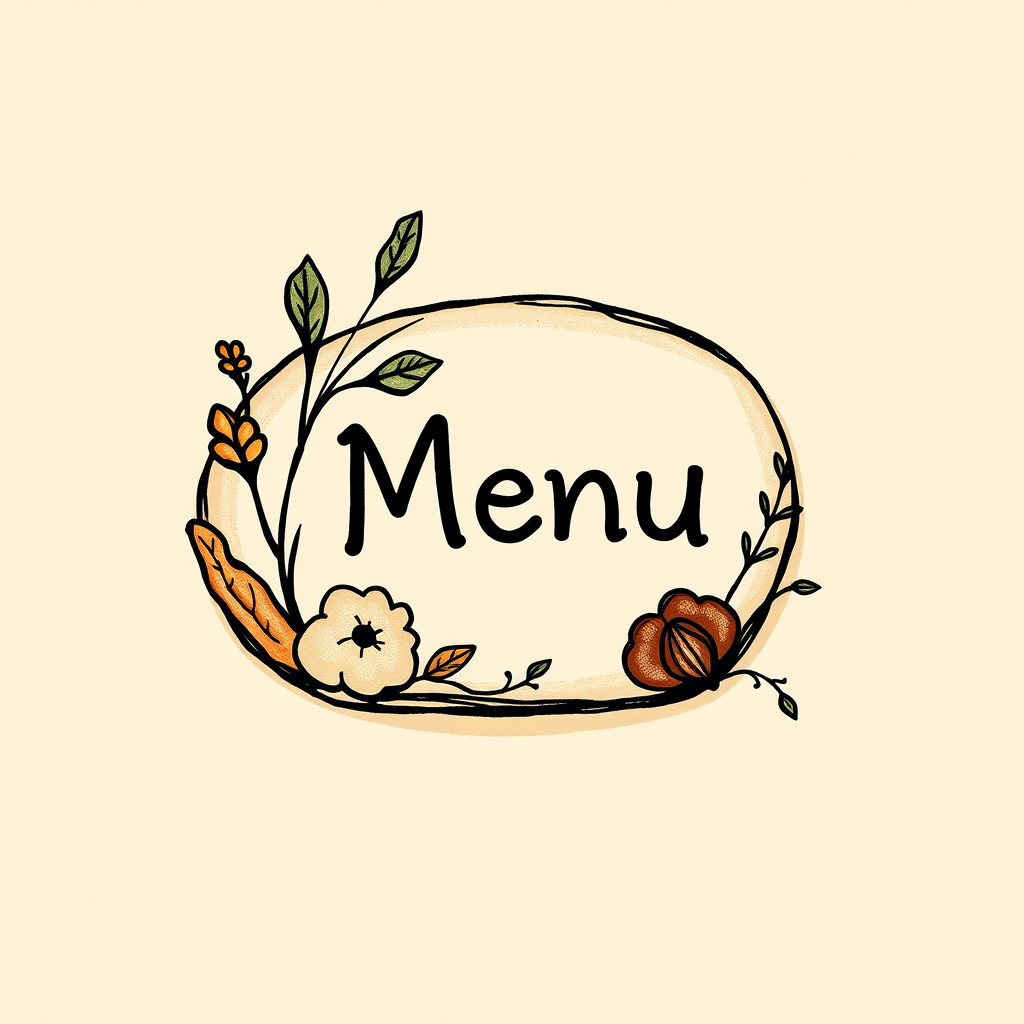 A hand-drawn, earthy-toned UI/UX menu button icon inspired by Marc Chagall, featuring natural elements on a warm beige background, with subtle artistic embellishments to enhance its organic feel.