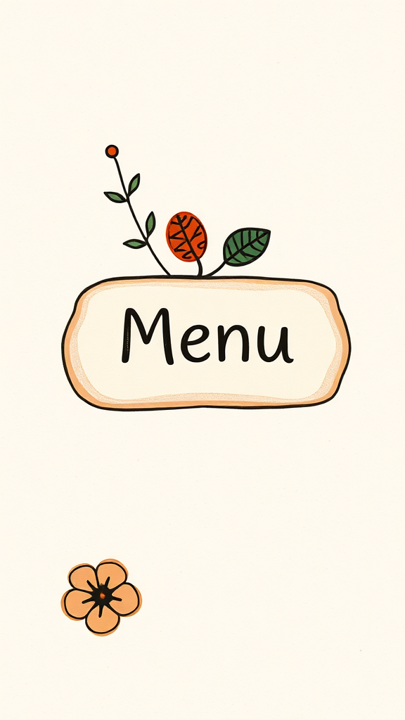 A hand-drawn style icon of a menu button inspired by Marc Chagall, featuring an earthy color palette with natural elements; designed for a website, set against a subtly textured beige background for an organic feel, with soft lines and whimsical touches evoking a sense of harmony with nature.