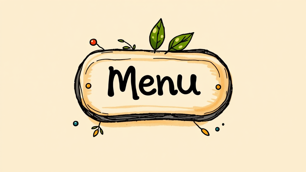 A hand-drawn UI/UX icon of a menu button, inspired by Marc Chagall's artistic style, featuring an earthy color palette with natural elements, set against a beige background, with creative touches that enhance the organic feel while retaining the original concept.