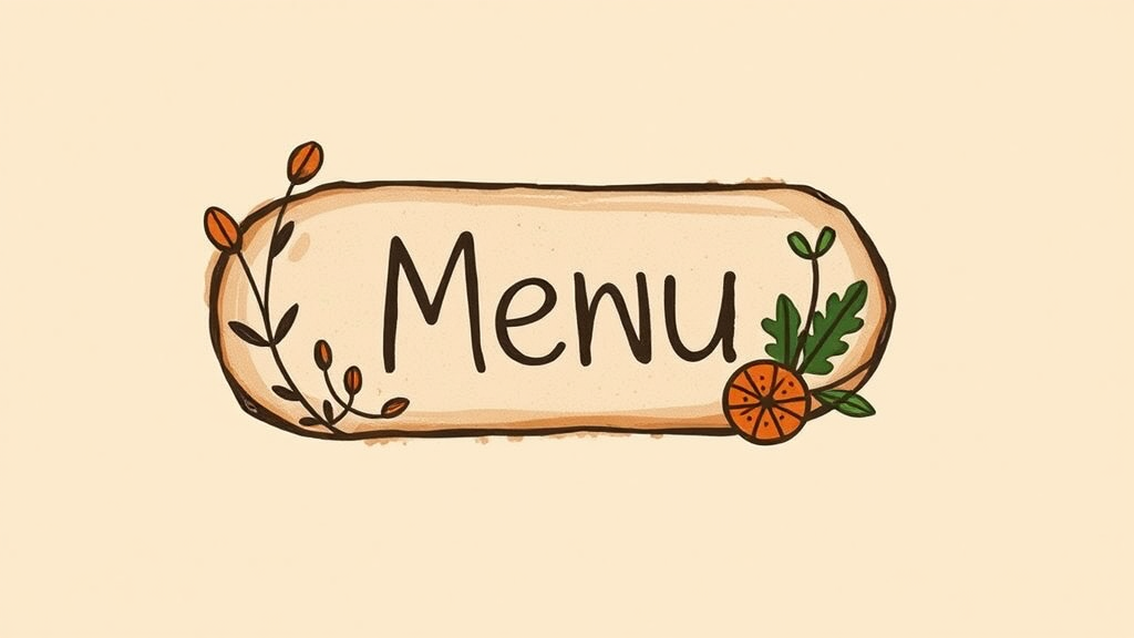 A hand-drawn UI/UX menu button icon inspired by Marc Chagall's art, featuring an earthy color palette with natural elements, set against a beige background, with subtle creative enhancements to capture a whimsical and organic feel.