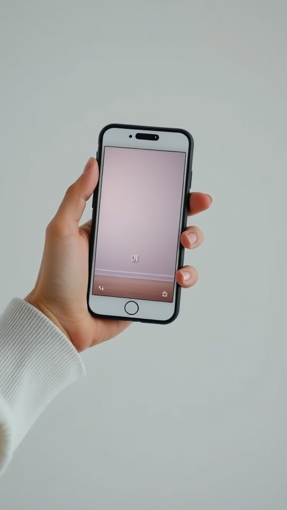 A hand gently holds an iPhone displaying a minimalist, realistic image that captures the essence of studyblr. The scene is sharply focused and imbued with a raw, unfiltered aesthetic, highlighting the simplicity and sophistication of the moment.